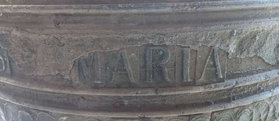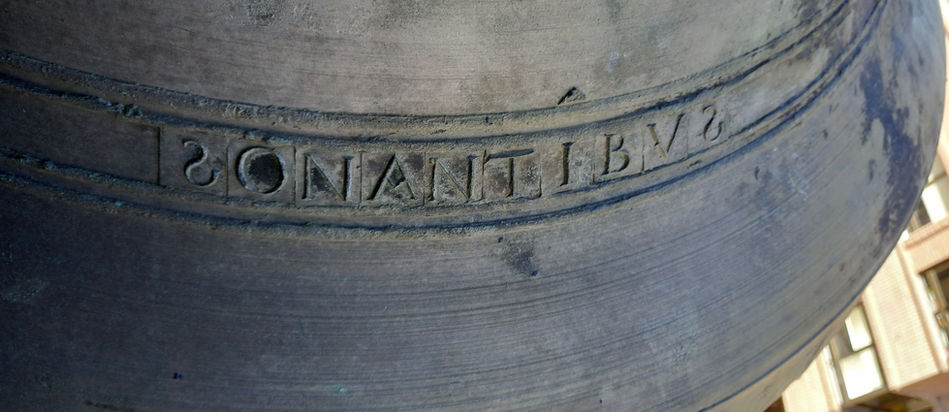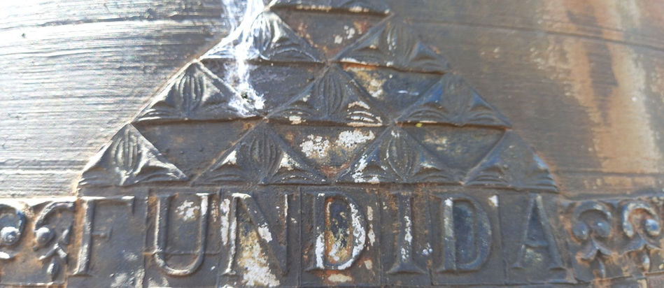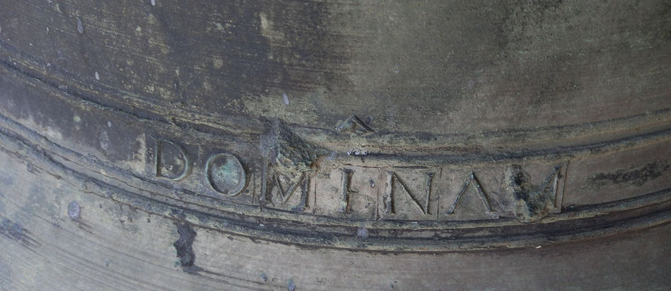 En el Medio Pie, entre cuatro cordones puede leerse: “LAVDATE DOMINVM INCYMBALIS BENE SONATIBVS ###” lo que podría traducirse como: ALABAD AL SEÑOR CON CAMPANAS DE BUEN SON.
