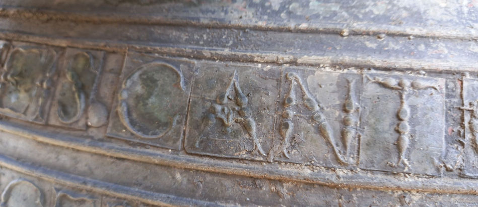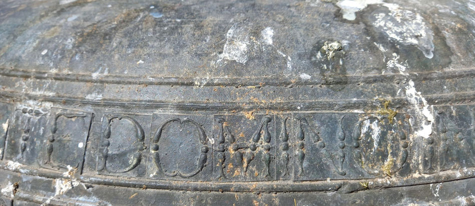 CANTATE DOMINO IN CYMBALIS. JUDITH C 16 V2: Esta frase hace referencia al verso 1 del pasaje bíblico de Judith 16, el cual además pretende completarlo mencionando el verso 2 en la propia inscripción (V2). La traducción de la epigrafía es: CANTAD AL SEÑOR CON CAMPANAS.