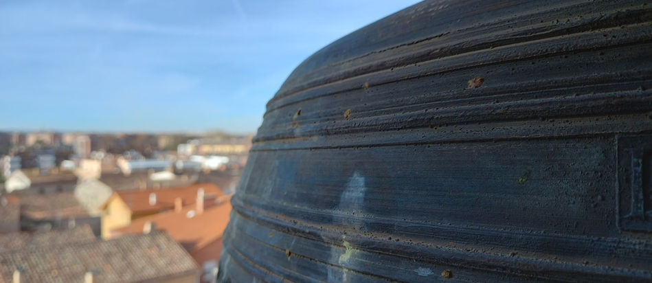 DESCRIPCIÓN: Campana de perfil esquilonado moderno, con influencias holandesas, del mismo perfil que las que hacía Benito Perea Alegría en los años 20 del pasado siglo, pero esta, a pesar de no estar firmada, es de Ortiz, así lo atestiguan su decoración, tipografía y decoración.