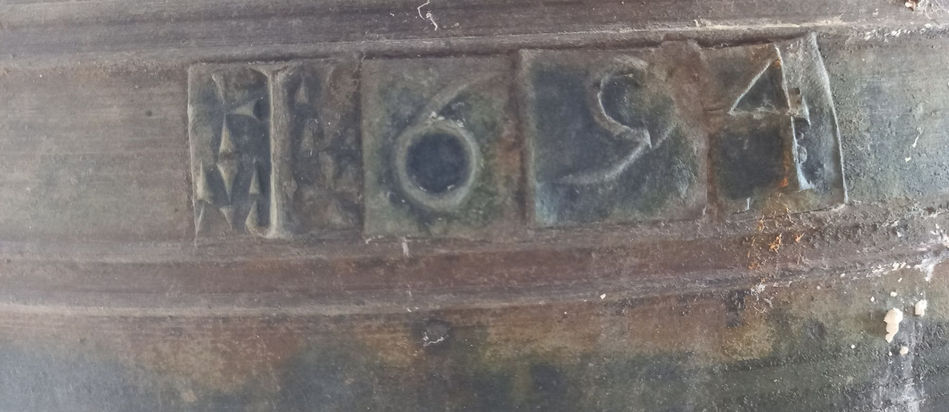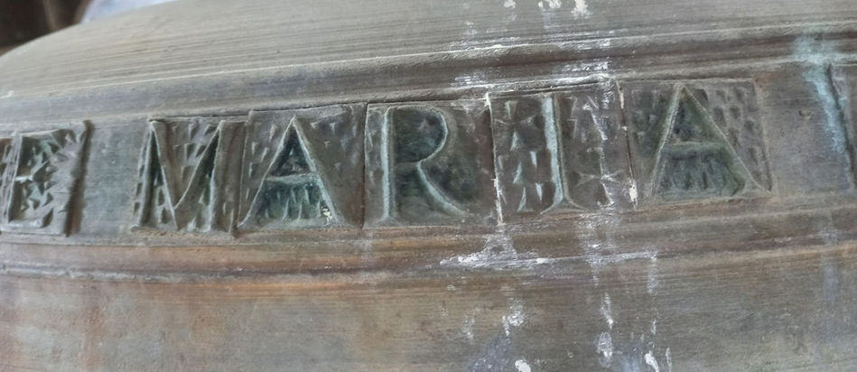 En el tercio, entre cuatro cordones tiene una inscripción que dice: “AVE MARIA GRACIA PLENA S TE ESTE FANI ORA PRO NO BIS 1654”, que debieron escribir: AVE MARIA GRATIA PLENA STE STEPHANE ORA PRO NOBIS 1654 y que traducido al español sería: AVE MARIA, LLENA ERES DE GRACIA, SAN ESTEBAN RUEGA POR NOSOTROS 1654.