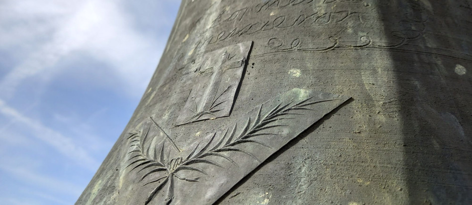En el Medio tiene una cruz con pedestal orientada hacia el Oeste y en el lado contrario tiene la firma del autor realizada a mano alzada donde puede leerse: “Los Menezo meiscieron”, y bajo esta un pequeño crucifijo sobre una decoración vegetal (esta decoración vegetal se encuentra orientada en los cuatro puntos cardinales, alrededor de toda la campana).