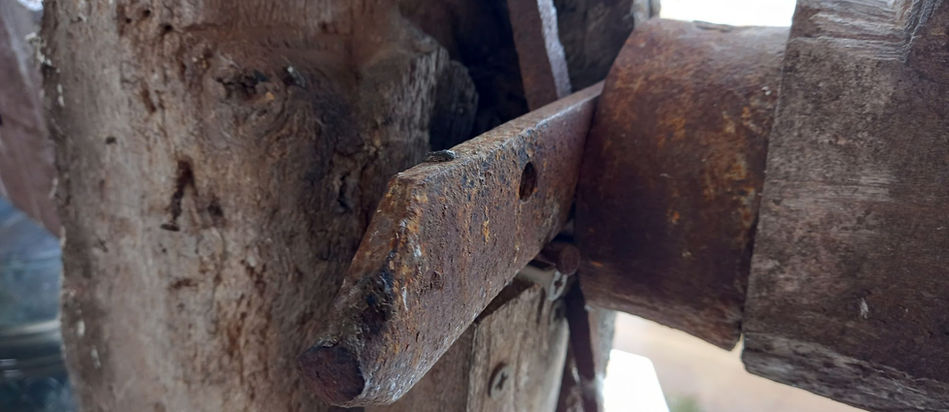 El yugo y la Melena es nuevo, hecho en el mismo año que la campana por la misma empresa, pero no le pusieron ni abarcón interior ni machembrado entre las piezas, por lo que con el movimiento, la pieza intermedia se ha desplazado hacia la izquierda. El Murrión del yugo tiene una palanca, probablemente para el bandeo a distancia y seguramente porque la anterior Melena lo tuvo también.