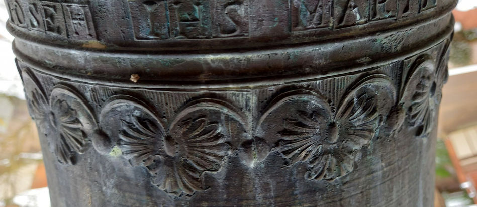 DESCRIPCIÓN: La campana, de perfil romano, conserva en parte la inscripción de la anterior, así como la decoración de la misma. Tiene dos inscripciones. La primera en el Tercio, entre cuatro cordones dice: “IOSEPH IHS MARIA” Bajo los cordones donde se encuentra esta inscripción cuelga una cenefa decorativa con motivos vegetales y pompones alternos.